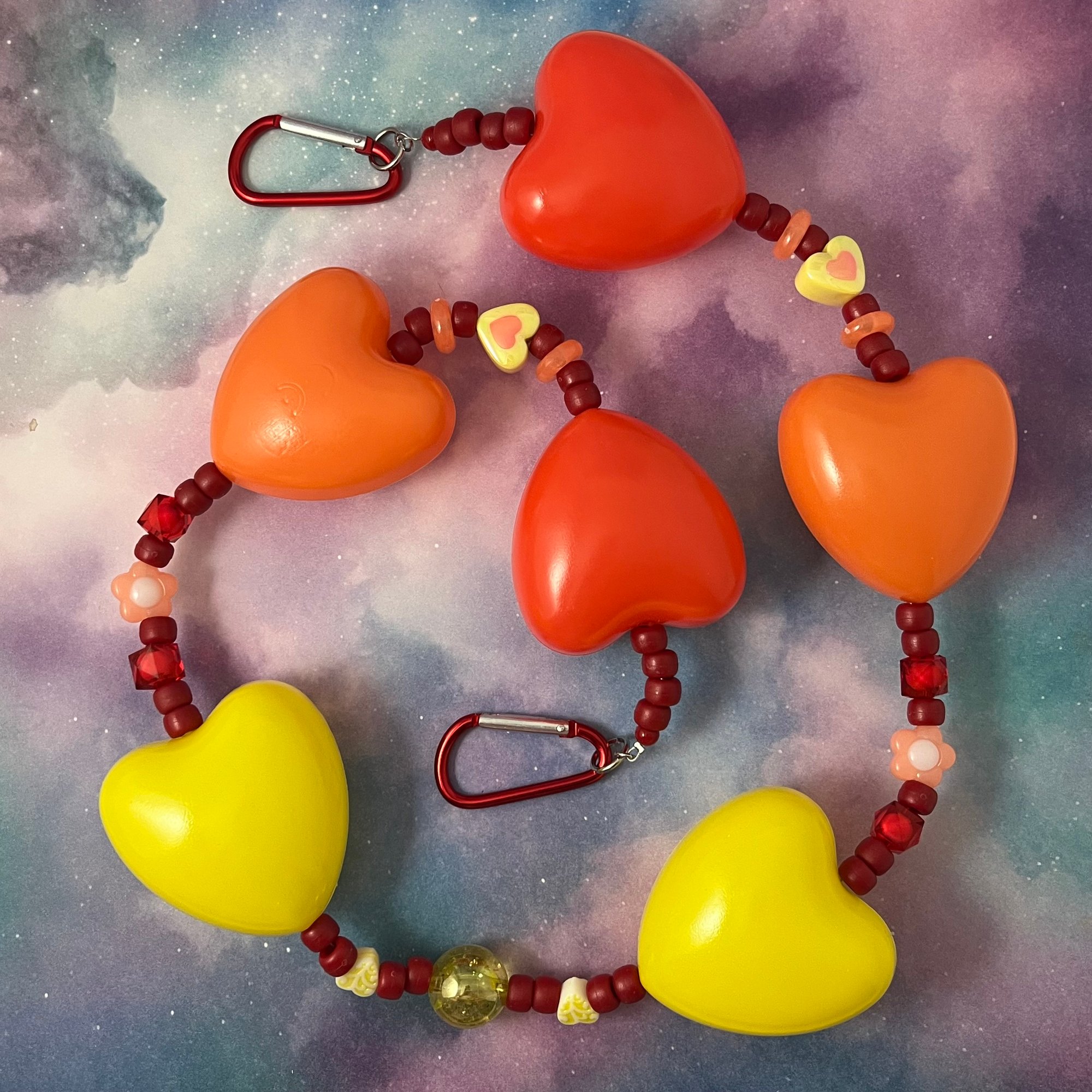 Pony beads and heart shaped ball bit balls. Finished with carabiner clips!