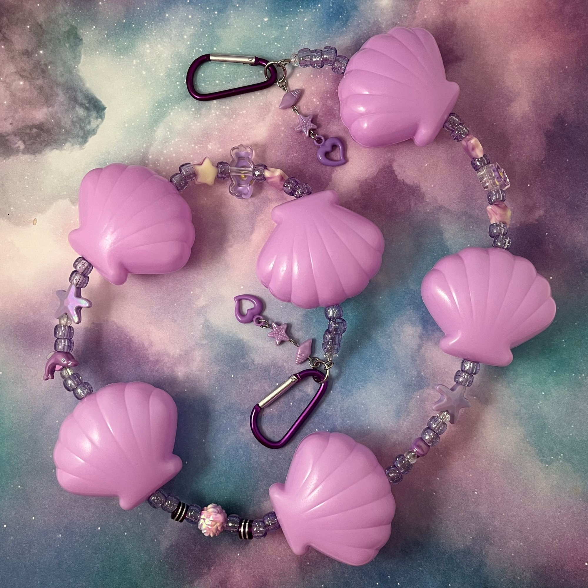Pony beads and seashell shaped ball bit balls. Finished with carabiner clips!